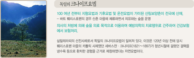 삼림테라피의 선진사례로서 독일의 크나이프요법이 알려져 있다. 이것은 120년 이상 전에 당시 붸리스호펜 마을의 카톨릭 사제였던 세바스챤·크나이프(1821~1897)가 청년시절에 걸렸던 결핵을 냉수욕 등으로 환치한 경험을 근거로 제창하였다는 자연요법이다.