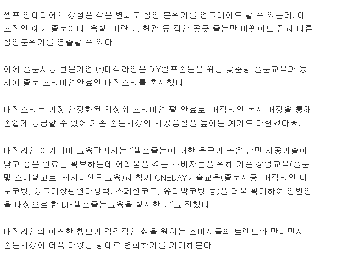 매직라인 줄눈교육 및 프리미엄줄눈안료 '매직스타'출시관련기사